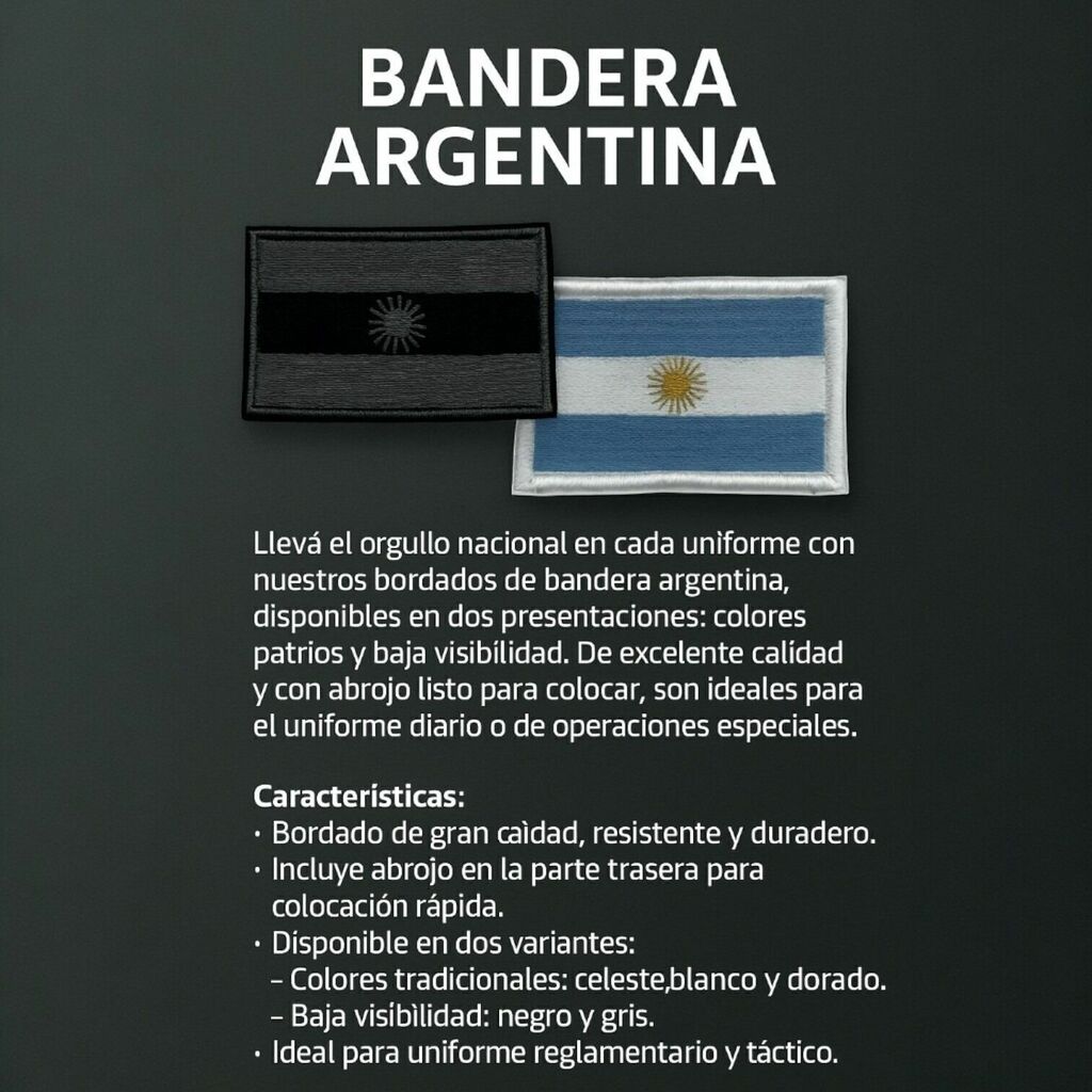 Un clásico infaltable para completar tu uniforme. Este bordado de la bandera argentina viene listo para colocar gracias a su práctico abrojo trasero. Ideal para identificar pertenencia con orgullo y prolijidad en prendas tácticas o de trabajo.
