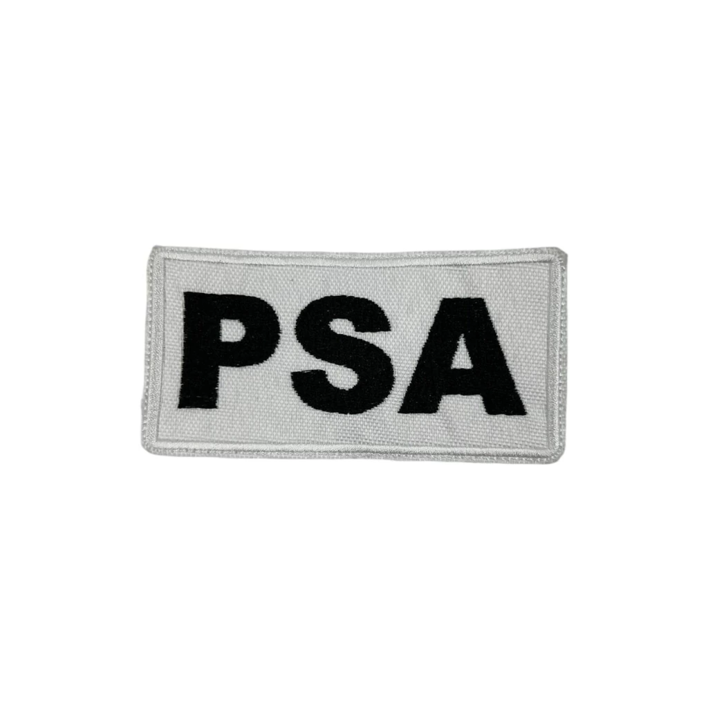 Cartel bordado en campo con la sigla “PSA” (Policía de Seguridad Aeroportuaria), confeccionado con letras rellenas de gran volumen y definición. Su bordado tipo campo ofrece mayor presencia visual y durabilidad. Viene con abrojo trasero, listo para colocar en chalecos, camperas o camisas.