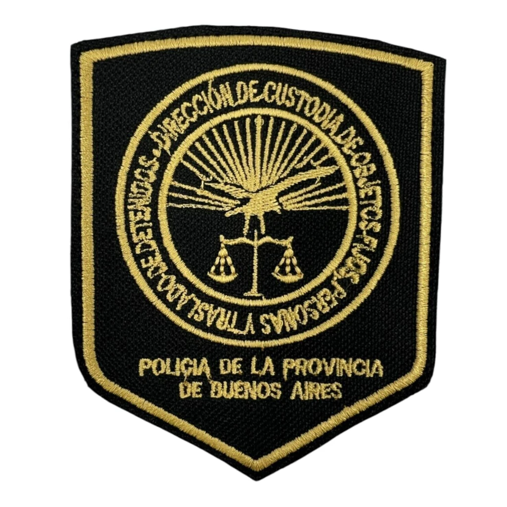Diseñado para el personal de la Dirección de Custodia y Traslado, este escudo bordado refleja profesionalismo y pertenencia. El color dorado resalta sobre el fondo negro, ofreciendo un diseño sobrio y representativo.