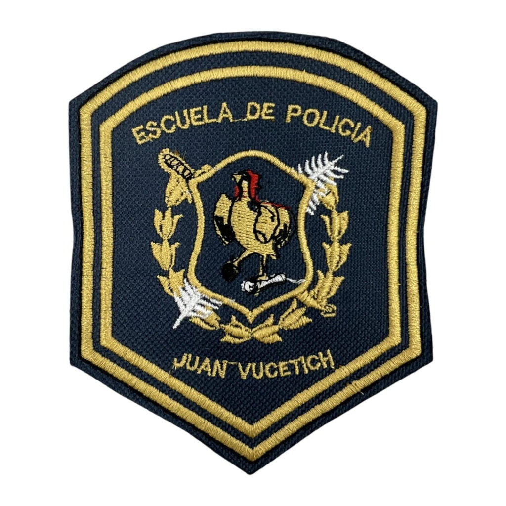 Versión jerárquica del escudo bordado oficial de la Escuela de Policía “Juan Vucetich”. Con el tradicional diseño del gallo y el marco doble dorado, este modelo se destaca por su presencia y elegancia, ideal para personal de mayor rango o uso institucional.