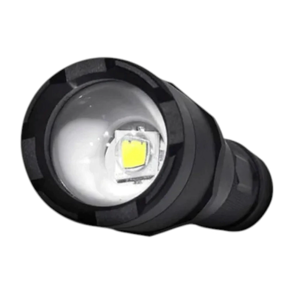Ofrece una potencia máxima de 400 lúmenes, con 5 modos de luz: alta, media, baja, estroboscópica y SOS, además de un modo de apagado (OFF) mediante una presión de 3 segundos. Gracias a su sistema de zoom óptico con cabezal giratorio, podés ajustar el haz de luz según la necesidad.