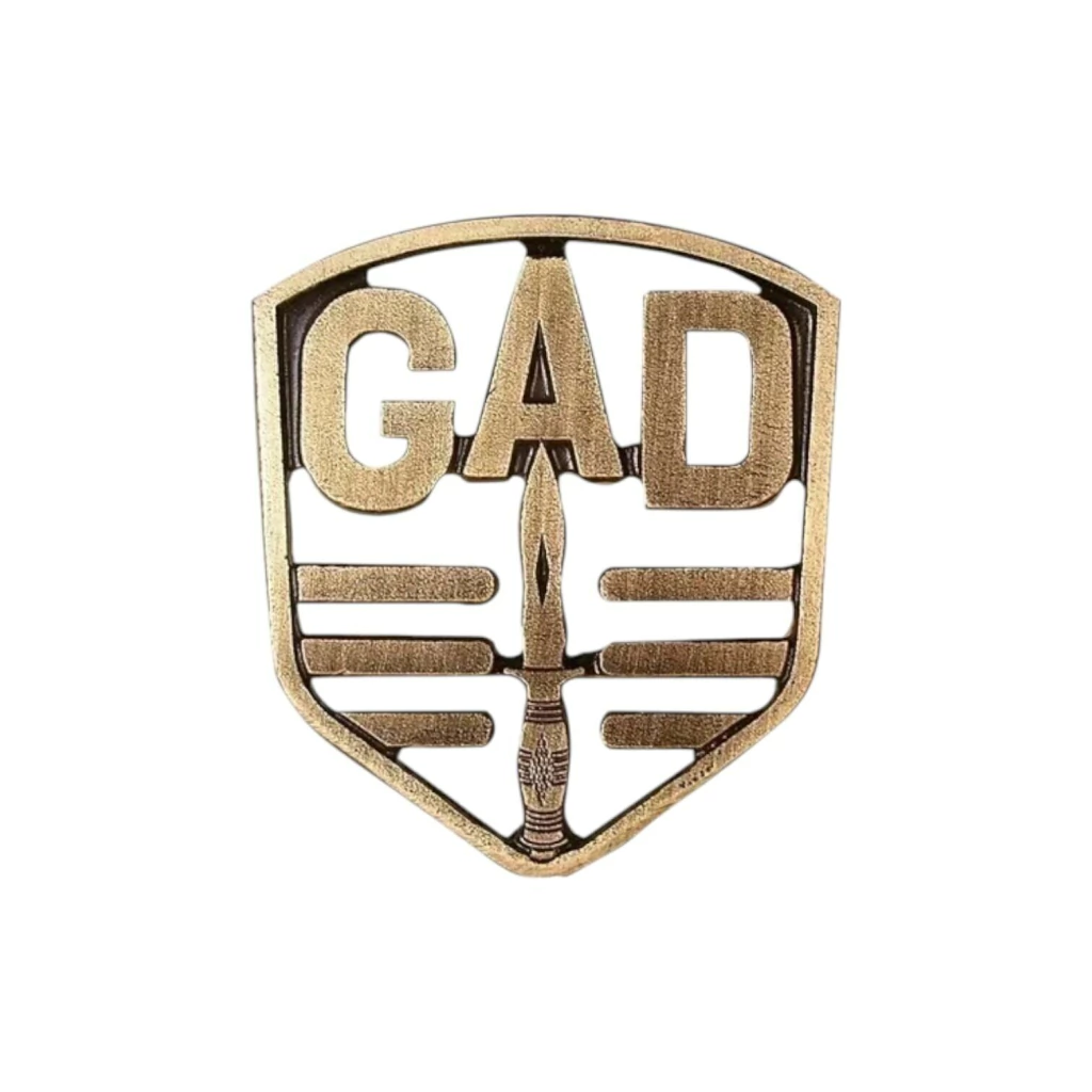 Distintivo metálico oficial del Grupo de Apoyo Departamental (GAD), diseñado para ser colocado en la boina reglamentaria de los efectivos. El escudo institucional presenta la sigla GAD acompañada por una daga central y franjas horizontales, símbolo de intervención táctica y apoyo operativo.