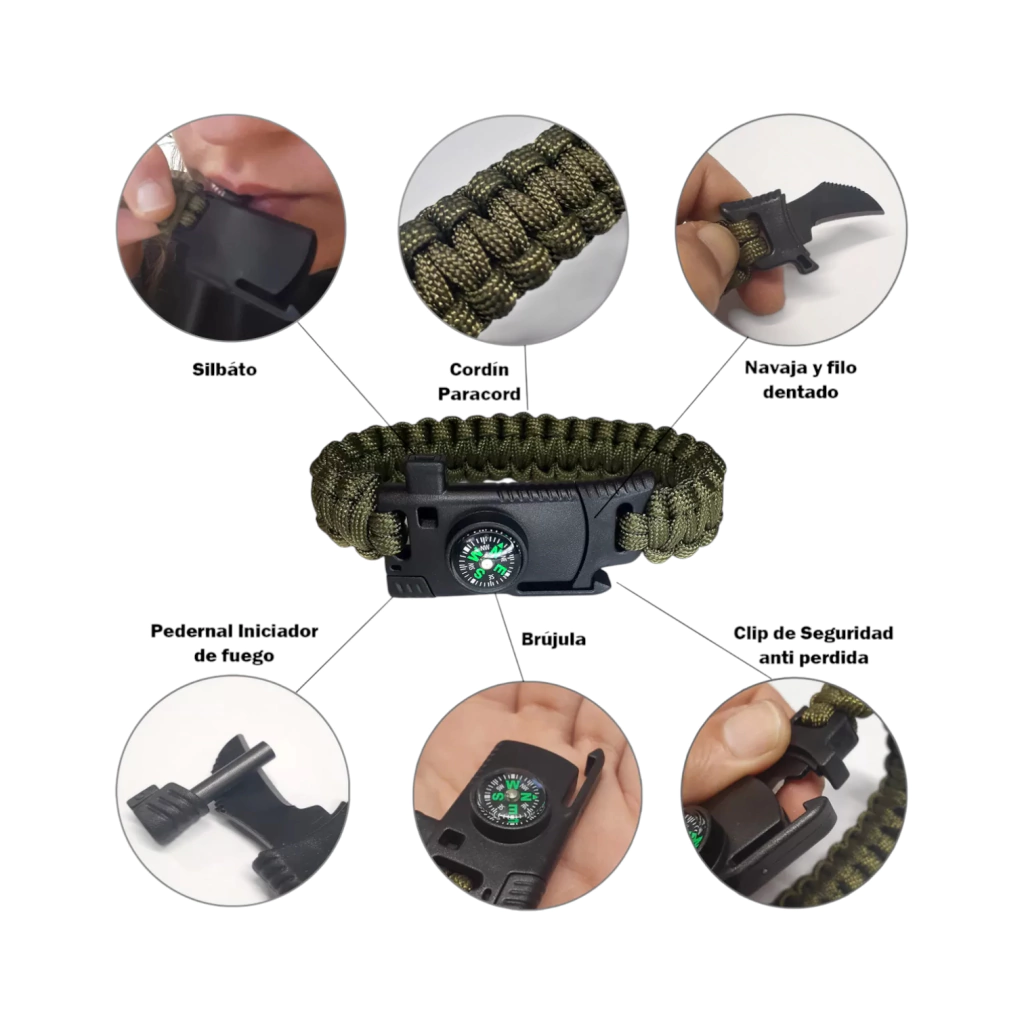 Llevá la preparación a tu muñeca con nuestra Pulsera Paracord, el accesorio esencial que combina la resistencia de la cuerda Paracord con herramientas de supervivencia multifuncionales. Diseñada para ofrecerte máxima funcionalidad y confianza en tus expediciones al aire libre.