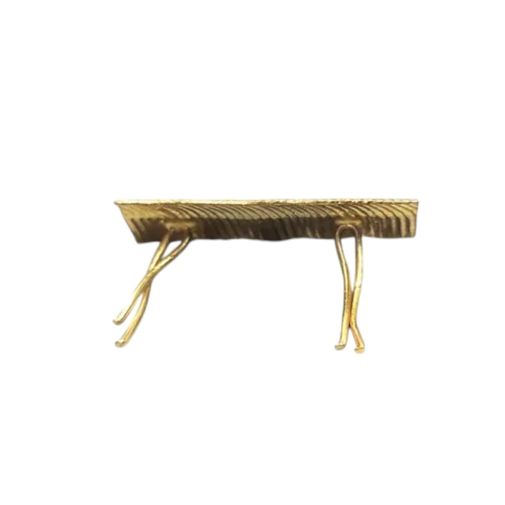 Fabricada en metal dorado con terminación texturada en relieve, su diseño presenta cinco ondas bien definidas que aportan autoridad y presencia. Cuenta con patas traseras que permiten ajustarla con firmeza sobre charreteras o prendas institucionales.